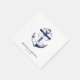 Nautical blue and white wedding napkins. Great for a Navy (military) or lake house wedding. Design features an anchor wrapped in a banner with text "Anchored in love". Personalise it with your wedding details.