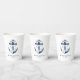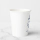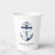 Nautical blue and white wedding paper cups. Great for a Navy (military) or lake house wedding. Design features an anchor wrapped in a banner with text "Anchored in love". Personalise it with your wedding details.
