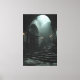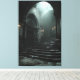A monumental stone staircase rises through swirling mist inside a decayed Gothic cathedral, illuminated by soft daylight streaming through a broken oculus high above. Tall arches, cracked columns, and an imposing carved door stand in solemn silence, their surfaces aged by time and water, while faint sconce light adds warm flickers to the cold gray stone. The atmosphere is heavy with reverence, melancholy, forgotten sanctity, and the quiet pull toward transcendence—ideal for meditation rooms, moody bedrooms, home offices, therapy spaces, gothic-themed reading nooks, or as evocative gifts for lovers of ancient architecture, spiritual introspection, dark romanticism, fantasy ruins, or anyone drawn to haunting, atmospheric depth.