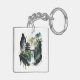 A beautiful square keychain showing an ink illustration of a landscape with ancient Chinese architecture and majestic waterfalls.