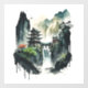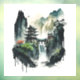 A beautiful window decal/window cling showing an ink illustration of a landscape with ancient Chinese architecture and majestic waterfalls.