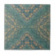 Unique decorative tile design featuring a distressed-looking damask pattern in shades of teal and beige.