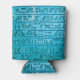 A blue can cooler with ancient hieroglyphs engraved on stone. Great as a utensil holder too!