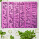 A set of purple kitchen towels with ancient hieroglyphs engraved on stone.