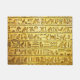 A yellow door mat of ancient hieroglyphs engraved on stone.