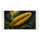 A bold woodcut-style concept art and editorial illustration featuring a magnificent, oversized golden-yellow feather with strong graphic lines defining its barbs. The feather rests upon stylized dark green fern foliage and is decorated with intricately carved jewel-like inlays—diamonds and pearls—that catch stylized light, depicted through clean shapes and contrasting tones characteristic of woodcut art. The background showcases a simplified, sun-drenched waterfall and ethereal forest scene, rendered with high contrast, solid color areas, and woodcut textures. Using a limited warm color palette of golden yellows, deep greens, rich browns, and stark black outlines, the piece evokes themes of ancient magic, a lost fantasy relic, or a precious artifact from a futuristic, nature-integrated civilization. The overall composition is high-quality, emotionally evocative, blending sci-fi fantasy esthetics with a timeless, mystical allure.
