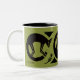 Ink drawings of plants and ancient geometric foxes on green mug. Inspired by Ancient pottery style. Rock art.