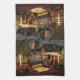 In the background is a quiet mediaeval city street in late afternoon, the warm glow of the setting sun enhanced by the lamps burning along the walls.