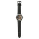 Custom stainless steel black leather watch featuring an illustrated portrait of Andrew Tate seated at a chessboard with his signature hand gesture. Perfect for everyday wear or as a unique gift.
