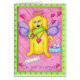 "I'm just an Angel". Tell someone they are an angel too with this delightful card. You can add a written message of thanks, hello or any other special message. The Angel Dog is full of life with doting, loving eyes, a halo and hearts to show his love. A rolled newspaper and a dog food bowl filled with bones accompany "Angel Dog". Outside text says "I'm just and angel" and inside text says "and so are you" so you can tell someone you care. Angel Dog is show on a pink striped background and a green border.