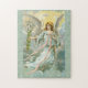 vintage painting in pastels with an angel in light blue dress and holding flowers.