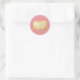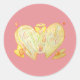 The inspirational word "Angel" rests on soft pastel angel wings. The word is topped by an angel halo hovering above pink and yellow hearts. The background is a subtle rainbow of cross-hatching. A few golden yellow hearts float around the edges. A version of this art comes with a light layer of glitter around the edges to give it an angelic twinkle.