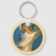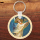 vintage art with painting of an angel with angelic expression, beautiful flowing dress and golden harp in blues and beige.