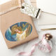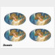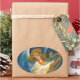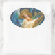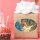 vintage painting of an angel with angelic expression, beautiful flowing dress and golden harp in blues and beige.