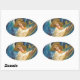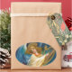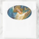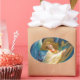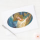 vintage painting of an angel with angelic expression, beautiful flowing dress and golden harp in blues and beige.