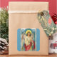 vintage painting of an angel with with a large red ribbon, lovely white smock with gold trimmings and hands together in prayer