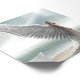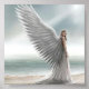 The Angelic being is standing by the ocean. the Light is in the sky Shining down on the Angel who's wings are White and grey.