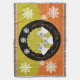 Angels Oh Come Let Us Adore Him Christmas throw blanket features a beautiful design with a background of polka dotted orange and mustard, a ring of solid black, and a ring of mustard with white polka dots and orange text that reads Oh Come Let Us Adore Him! Three little angels and white snowflakes add to this pretty Christmas throw that will be treasured for years to come!