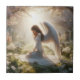 This ceramic tile artwork presents a tranquil and angelic scene. At its centre is a kneeling figure with large, white wings, draped in an off-the-shoulder, flowing white gown. The figure's long hair cascades gently, adding to its serene and celestial presence. The setting is a lush, garden-like space filled with delicate white flowers and abundant greenery, creating an ethereal atmosphere.