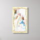 vintage painting of two angels with blue and white cloaks holding a gold cord and ringing a bell. suitable for children.