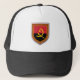 The national flag of Angola is infused into a grey shield shape. Thr inner shield containing the flag is surrounded by outlines decorated in the flag colours.