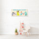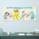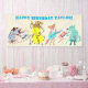 This banner for a child's birthday is fun and colorful. A hyena is playing drums, a cheetah is playing bass, a fox is playing electric guitar, and a wolf is playing keyboard. Add your child's name.