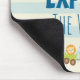 A cute personalised mousepad which says explore the world. Designed with a cute childrens themed nursery art illustration of a little doggy riding in an aeroplane and a toy train filled with whimsical animals. A doodle sun shining above. Set on a cream and blue striped background.
