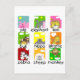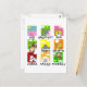 Animals on Parade postcard features various colourful animal images and kid style text. Animals include the hippo, giraffe, monkey, bull, lion, elephant, pig, zebra, and sheep.