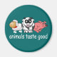 Animals Taste Good. The design features three cute cartoon animals, a cow, a pig and a sheep. Under then the words read “animals taste good”. It’s a f funny design, not to be worn to your neighbourhood vegetarian restaurant.