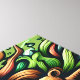 Three animated, stylistic bears appear in a dynamic and whimsical scene as they ride a classic green car through an abstract and colourful environment. The largest bear, with an expressive face, takes the lead, with the others cheerfully joining in the adventure. The swirling patterns and fiery motifs surrounding them add to the fantastical nature of this artwork.