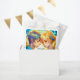 Personalised wedding treats. Anime boy and girl cuddling surrounded by yellow flowers. Lots of blue details.