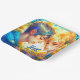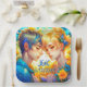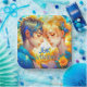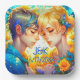 Personalised wedding paper plates for wedding reception or rehearsal dinner. Anime boy and girl cuddling surrounded by yellow flowers. Lots of blue details.