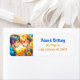 Personalised wedding return address labels. Anime boy and girl cuddling surrounded by yellow flowers. Lots of blue details.