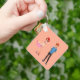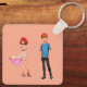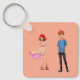 This square keychain features a charming anime-style illustration of a young couple against a solid peach-pink background. The girl has short red and green hair and is wearing a flowing white high-low dress with a pink lining and purple heels, posing with her arms crossed. The boy has spiky orange hair, wears a blue t-shirt, black pants, and blue sneakers, standing with his hands in his pockets. The image is printed on a durable square material, attached to a standard metal split ring and chain for easy attachment to keys or bags.
