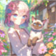 A pretty blue eyed anime girl holding a pretty blue eyed Siamese cat surrounded by flowers.