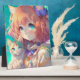 Beautiful Anime girl with two blue eyes holding an adorable kitten. Colours used are pink, teal, orange, blue, purple and blue. Cute and colourful children's Ai art. generatviecontent