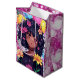 Pretty birthday gift bag. Cute graphics of a beautiful anime girl with darker skin and brown eyes with pretty pink flowers in her cute curly hair. These are cute for a teen or pre-teen girl. Colours are pink, purple, blue and yellow. This girl can represent anyone with darker skin such as Hispanic, Latino, Indian, Middle Eastern, African-American or Bi-racial. Pretty magenta bokeh background.