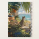 Anime style painting of a woman working at her home office desk with a laptop computer set against a large window overlooking an ocean view with her cats nearby.