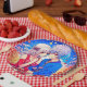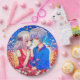 Personalised Valentine's Day Party paper plates with an anime theme. Anime boy and girl cuddling surrounded by colourful flowers. Colours are red, blue, white and red mostly.