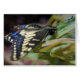 Original photograph of an anise swallowtail butterfly, resting on a yampah plant. Closeup side view of the butterfly, showing the beautiful yellow and black striped wings, with brilliant blue and orange highlights. Also showing the butterfly's head, its eyes and antennae and proboscis.