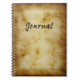 A photo reproduction some very old parchment paper, foxed and marked with age, and the title, "Journal".