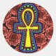 The ankh was the ancient Egyptian symbol of life. It was adopted by the 1960's counterculture as a symbol of spiritualism, and a rejection of consumerism and the establishment. This sticker has a yellow ankh with purple, blue, and green details on a background of pink roses.