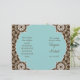 A lovely and romantic wedding program for the bride that leans to the contemporary with a tiny touch of tradition. The white damask pattern has a modern lace feel and the quatrefoil centre design is off-centre and fun! Aqua blue, chocolate brown and white is a very lovely colour combination. This invitation can be created in any colour combination you would like. All we need is a colour sample(s) and we're happy to set it up for you, just email us. PAPER RECOMMENDATION: Unless you are going to have these professionally scored and folded at a print shop, I recommend the value paper selection which is matte finish. The basic paper is high gloss outside and can crack with dark colours at the fold spot.