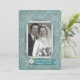 Open house for any wedding anniversary year with customised photo frame of couple. Background is sparkling teal damask with corner slit frame and bouquet.
