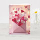 A pink envelope overflows with paper hearts in various shades of red, pink, and white, set against a softly blurred background with glowing lights.