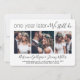 If unexpected circumstances have caused a postponement of your wedding reception, the first anniversary is a perfect opportunity to celebrate one year later. Invite family and friends to a simply elegant 1st anniversary party with this stylish modern 4 photo collage invitation. All wording is simple to personalise, including quote that reads "one year later we still do." Customise the amount of time between the wedding ceremony and anniversary party, whether it's just a few months or a couple of years. Include any information of your choice, such as marriage date, vow renewal plans, post-elopement party details, sequel wedding ceremony location, dress code, rsvp, website, etc. (IMAGE PLACEMENT TIP: An easy way to centre a photo exactly how you want is to crop it before uploading to the Zazzle website.) The modern minimalist black and white design features four pictures of the newlyweds, trendy handwritten script calligraphy, and chic typewriter style typography. Whether you eloped, had a smaller downsized minimony or micro wedding, or your special day celebration had to be rescheduled due to a covid pandemic related postponement, the happily ever after party can still get started. Congratulations to the bride and groom!