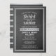 Can you keep a secret? Invite family and friends to an elegant and exciting surprise anniversary celebration with custom black, white and faux silver foil party invitations. All wording on this template is easy to personalize, including message that reads "Shhh! It's a SURPRISE." The design features a modern striped border on a faux chalkboard background, classic vintage art deco typography and stylish script calligraphy. Please note that silver is printed gray ombre color, not metallic foil. Congratulations and Happy Anniversary!