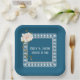 Elegant square white lace frame with white hydrangea bridal bouquet on blue background.
