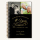 Celebrate any year wedding anniversary with a personalised guest book spiral notebook for signatures and well wishes in black and gold for the special couple. The design features an elegant calligraphy script typography design of # YEARS INTO FOREVER accented with interlocking linked hearts and personalised with 2 photos, their names and wedding dates or other custom text. Choose from hard cover or soft cover options on the ordering page. ASSISTANCE: For help with design modification or personalisation, colour change, resizing, transferring the design to another product, contact the designer BEFORE ORDERING via the Zazzle Chat MESSAGE tab below or email makeitaboutyoustore@gmail.com.