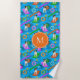 This colourful dog pool party beach towel for Parson / Jack Russell Terrier lovers features a pattern of four different JRTs / PRTs with varied brown and black head/body markings and a charming doggy head tilt standing on their colourful blue, pink, orange and lime pool float mats with a tennis ball in a clear blue swimming pool, surrounded by colourful swimming noodles and balls and yellow starfish-shaped floating chew toys - her monogram is customisable on a bright orange circle pendant - Parson / Jack Russell pool party © katz_d_zynes 2021